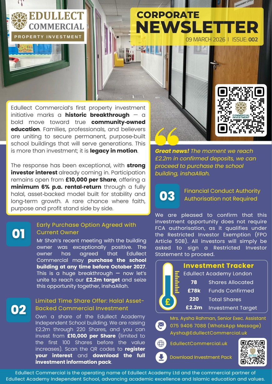 A community-backed, Shariah-compliant commercial property investment platform focused on acquiring and leasing educational real estate assets, supporting the expansion of Edullect Academy Independent School.